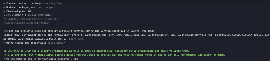 After entering this command, you'll need to log into your Apple account in the terminal and answer a few questions about the project, certificates, etc. Most of the time, I just press enter, enter, enter, lol.