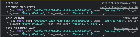 As you can see in the above screenshot, the data fetching operation is executed only once, yet we can conveniently use the fetched data in both the Home and RandomName components.